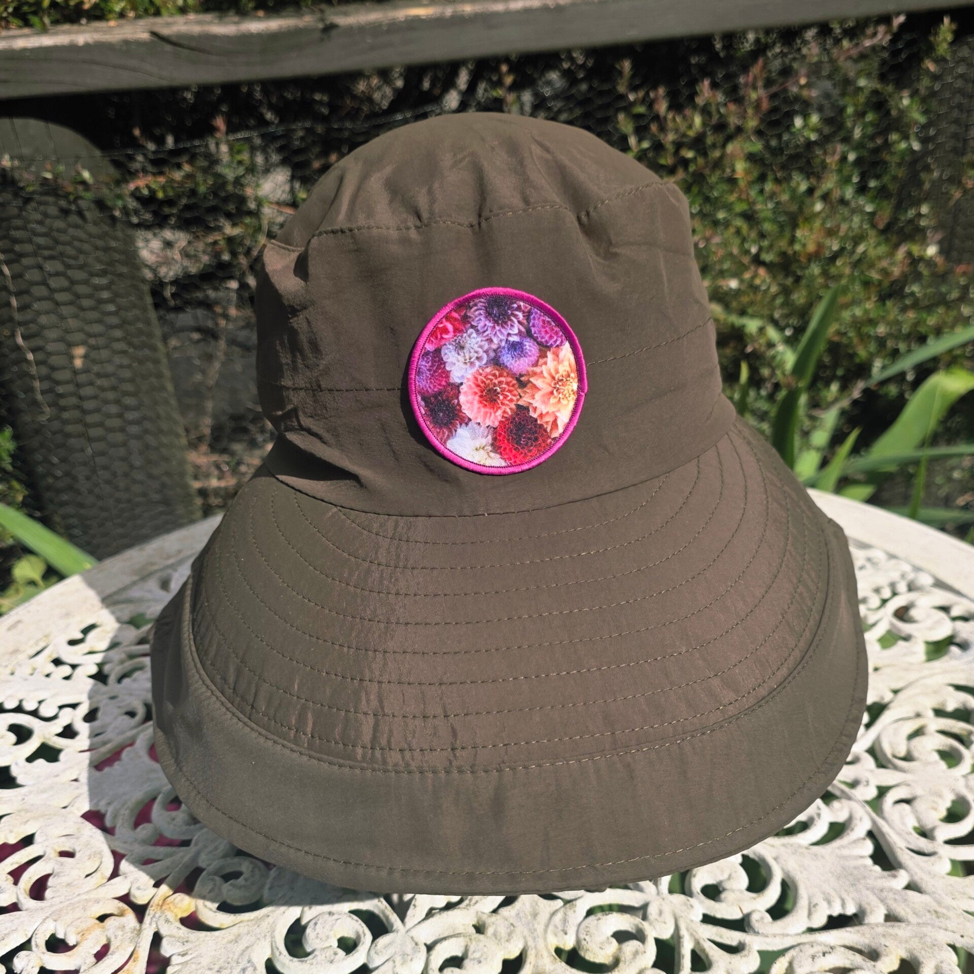 Featuring a simple, elegant dahlia design, this hat combines style with practicality. A discreet opening at the back allows you to tie up your hair with ease, while the adjustable back tie ensures a secure, comfortable fit.