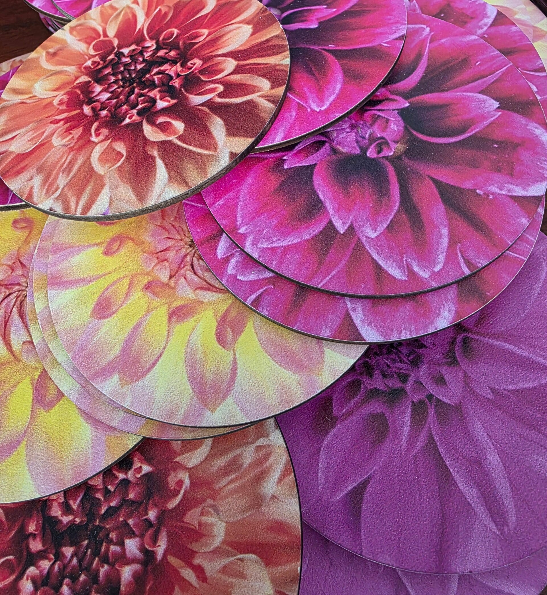 Add a touch of floral beauty to your table while protecting your surfaces. This set of 8 dahlia coasters features 4 stunning dahlia varieties, bringing colour and charm to everyday moments. Each coaster measures 10cm wide, making them the perfect size for mugs, glasses, and cups.